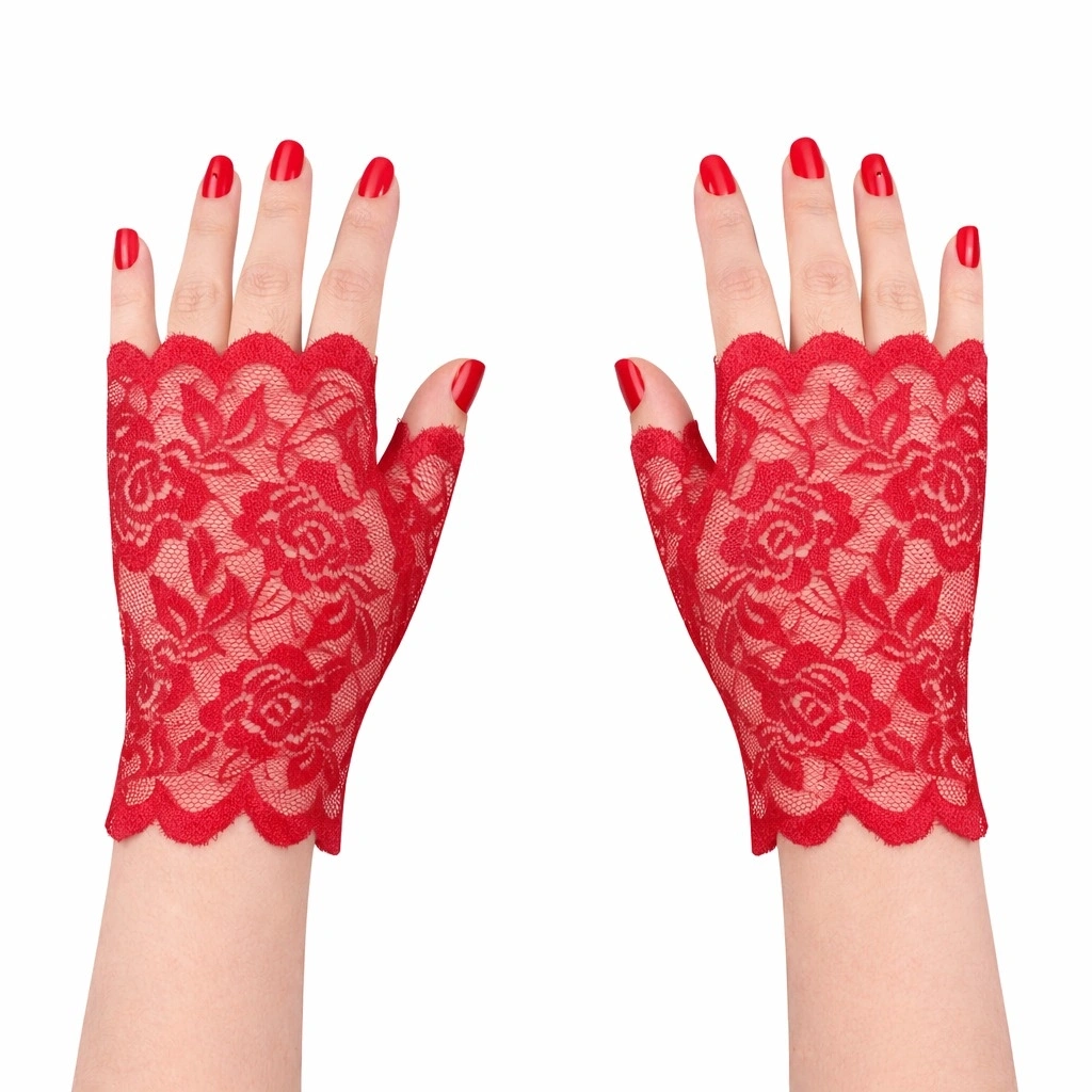 Zarif ve dikkat çekici tasarımıyla öne çıkan kırmızı gül desenli dantel parmaksız eldiven, özel günler, parti organizasyonları ve kostüm kombinleri için ideal bir aksesuardır. İnce dantel dokusu ve gül desenli tasarımı ürüne estetik ve şık bir görünüm kazandırır.